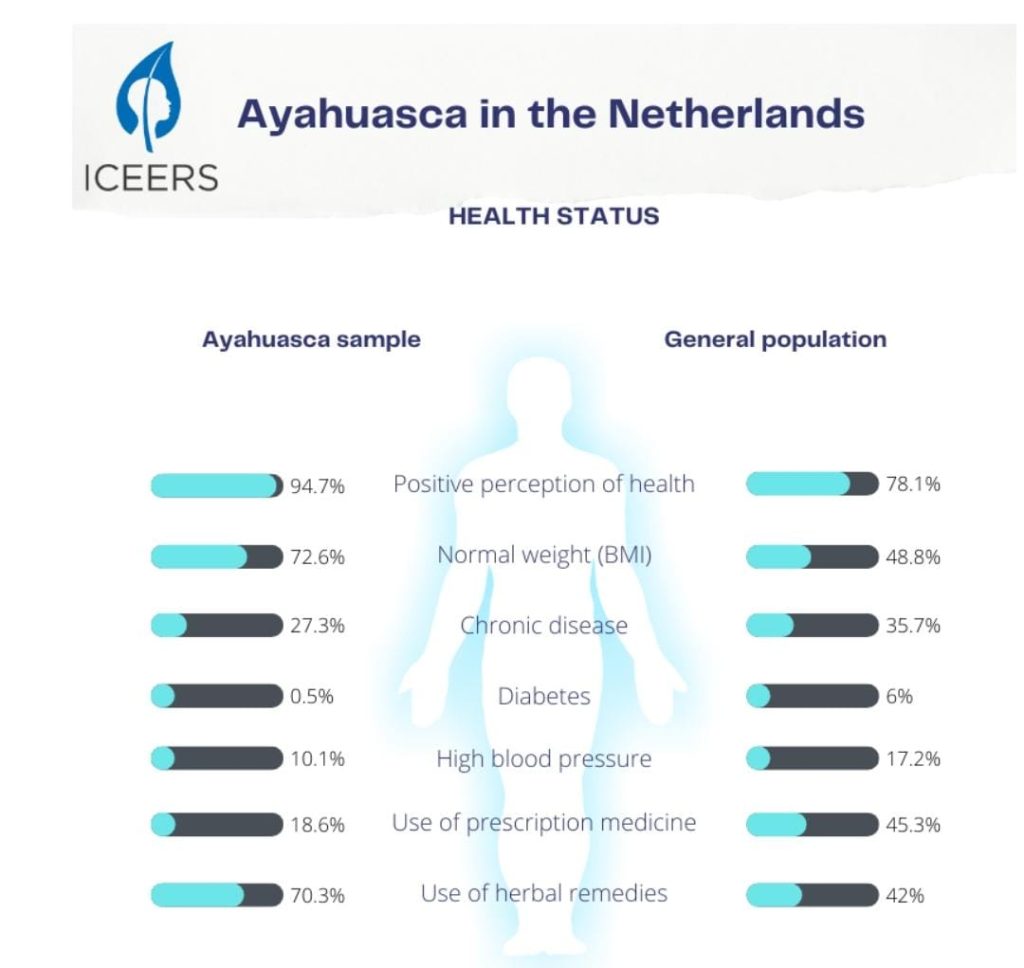 Un estudio publicado en 2022 en el Journal of Psychoactive Drugs constató que la ayahuasca puede ayudar a mantener un estilo de vida saludable. La investigación sobre el impacto a largo plazo fue realizada por el equipo de investigación de ICEERS, en colaboración con la Universidad Autónoma de Madrid, la Universidad Rovira i Virgili, la Universidad de São Paulo y la Universidad de Leiden. El estudio evaluó a 377 participantes que tomaban parte en ceremonias de ayahuasca en Holanda y usó para evaluar su estado de salud los principales criterios de salud pública que se utilizan por los gobiernos en lo que los usuarios de ayahuasca puntuaron por encima que la media de la población general por lo que la ayahuasca puede usarse no solo en tratamiento de trastornos o psicopatologías sino también para promover la salutogénesis y como práctica de autocuidado como lo es el deporte o la meditación. estudio completo: https://www.iceers.org/es/investigacion-ayahuasca-estilo-vida-saludable/