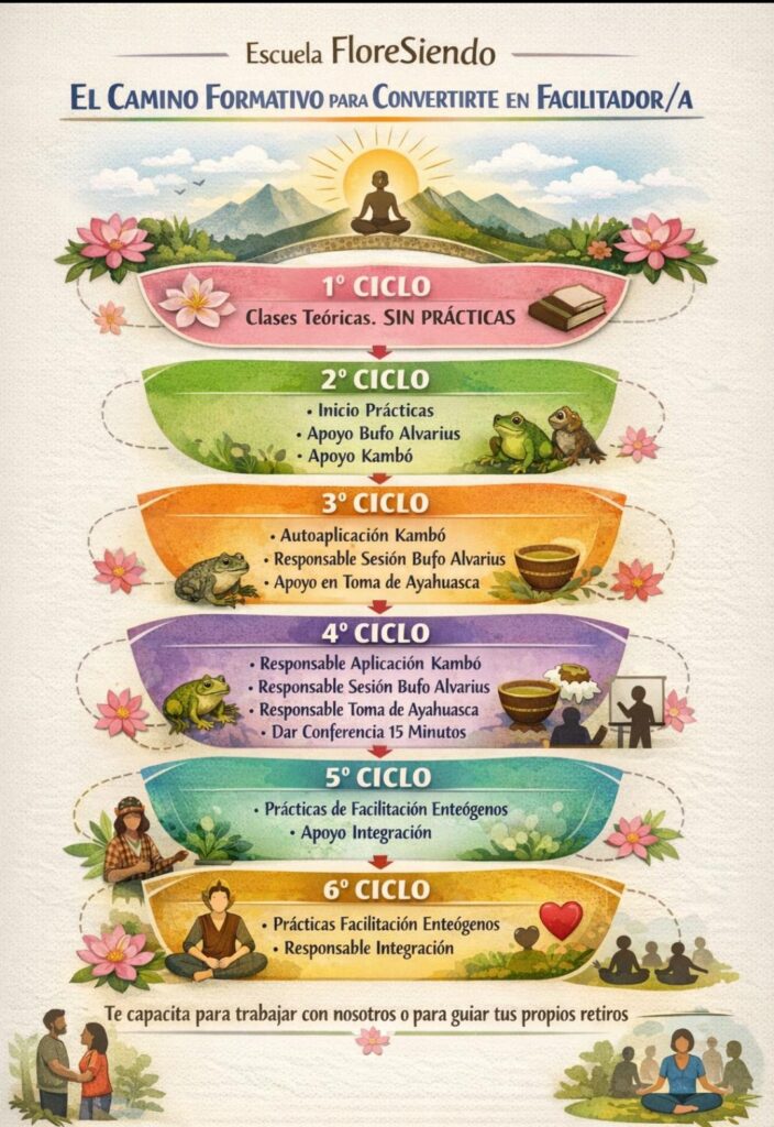 La Escuela FloreSiendo brinda una formación de seis ciclos formativos de 3 noches cada uno. En el CUARTO CICLO la persona ya facilita como responsable una sesión de ayahuasca supervisada por facilitadores veteranos profesores que lo acompañan en la noche.