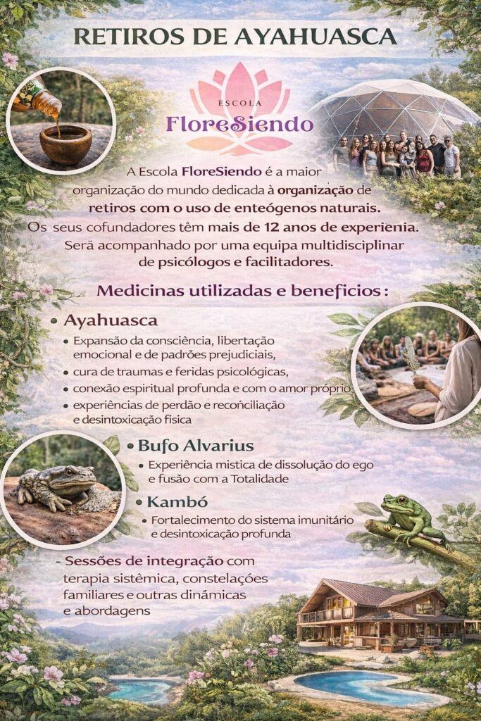 Trabalhamos com o uso consciente da ayahuasca, bufo alvarius, kambó, yopo e cogumelos psilocibinos. Estas medicinas facilitam um estado de expansão da consciência, cura psicológica, liberação emocional, conexão espiritual profunda e uma relação amorosa consigo mesmo. Também apoiam a desintoxicação física e a paz interior. São seguras, não causam dependência e podem ajudar a transformar a sua vida em alinhamento com o caminho da sua alma.